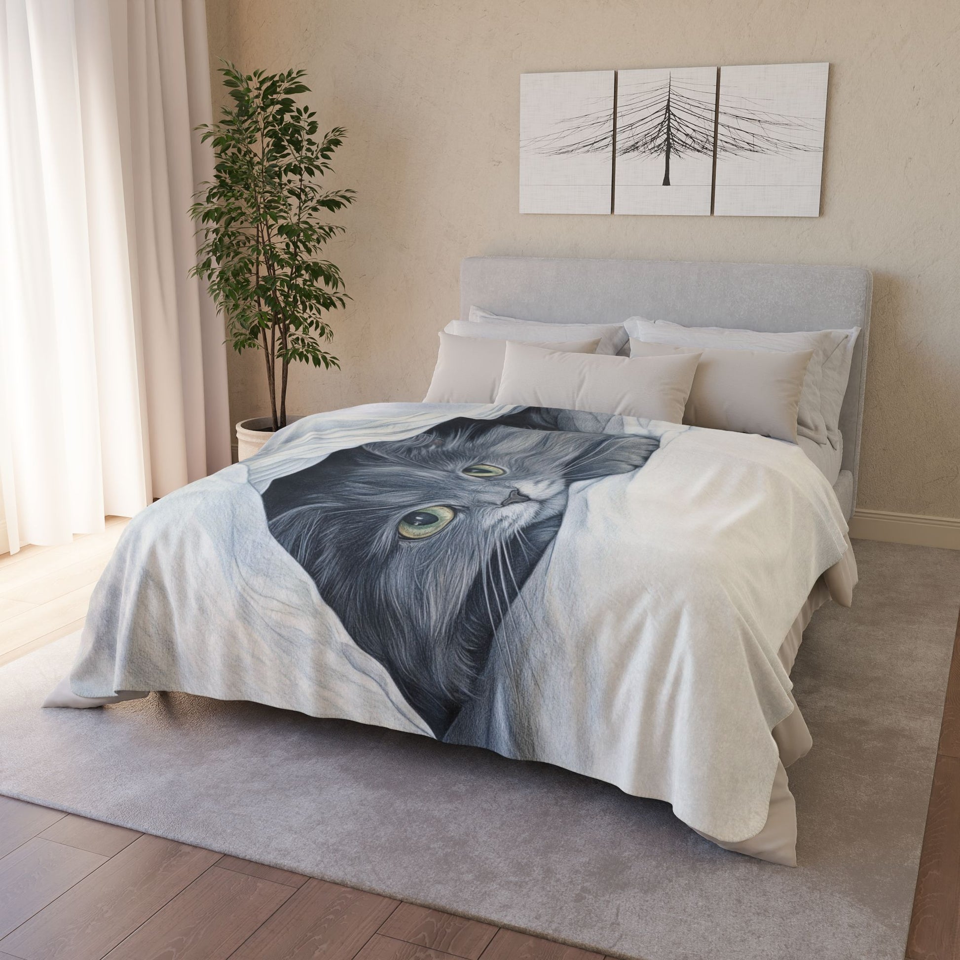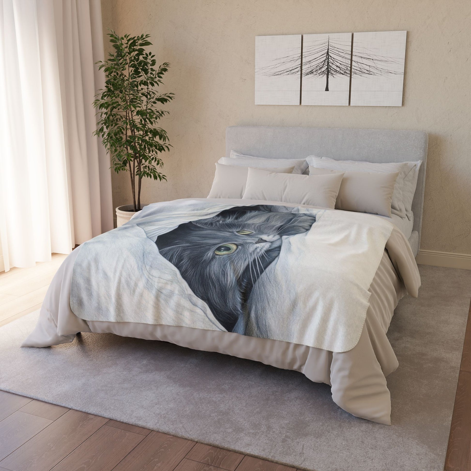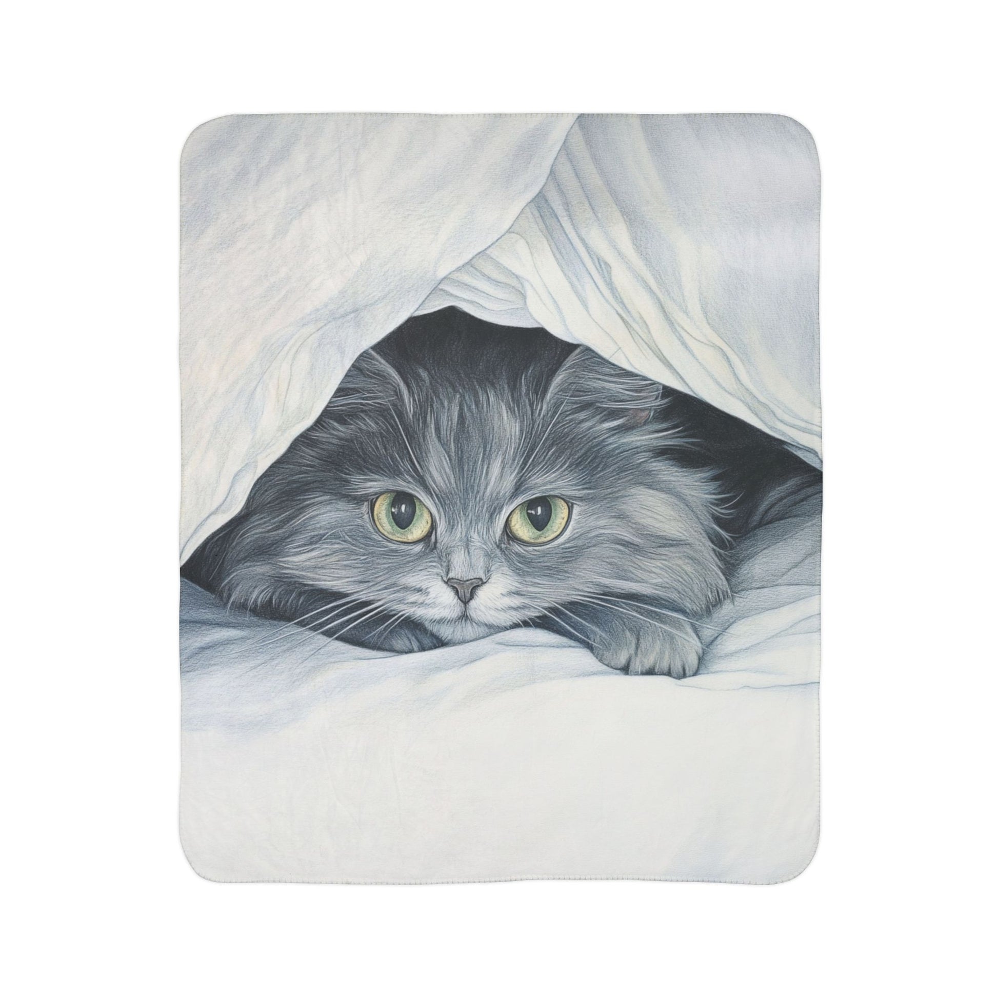 Observe: a very cute grey and white cat tucked perfectly beneath a blanket, with only the head peeking out like a small, judgmental marshmallow.