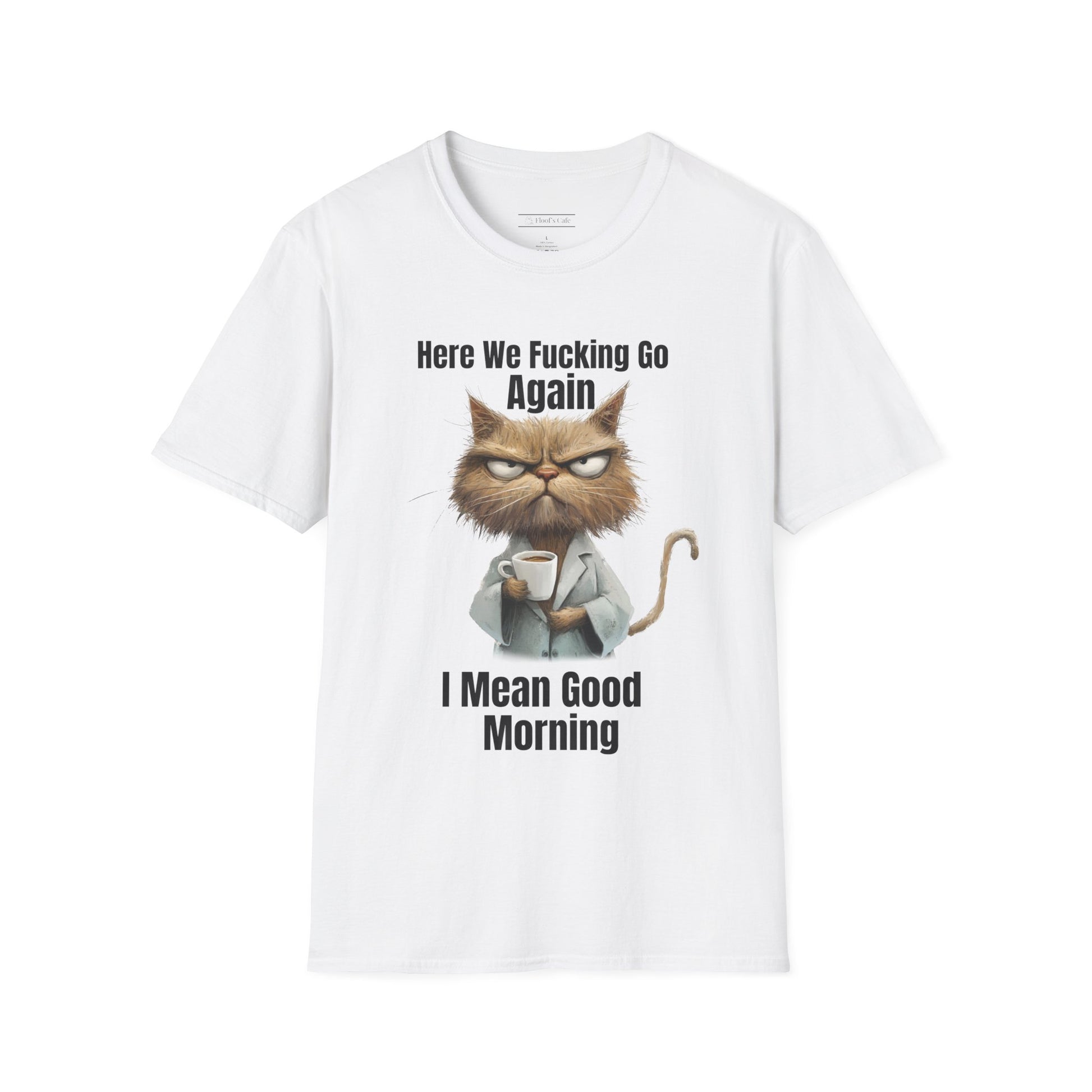 Mornings are bad enough. Being polite about them? Unthinkable. This T-shirt captures the exact amount of fake cheer required to survive yet another day of this nonsense — with a grouchy, bathrobe-clad cat who’s already over it. Coffee not included.